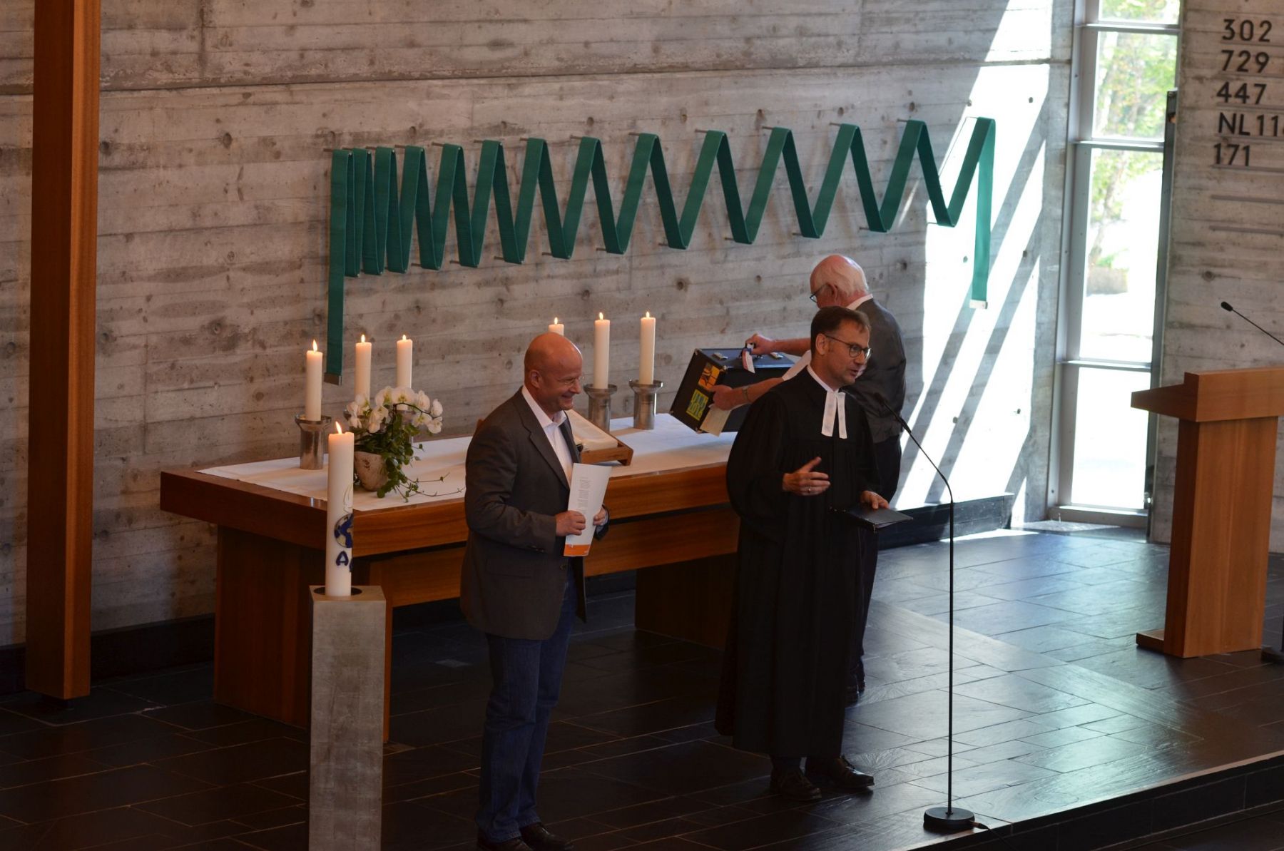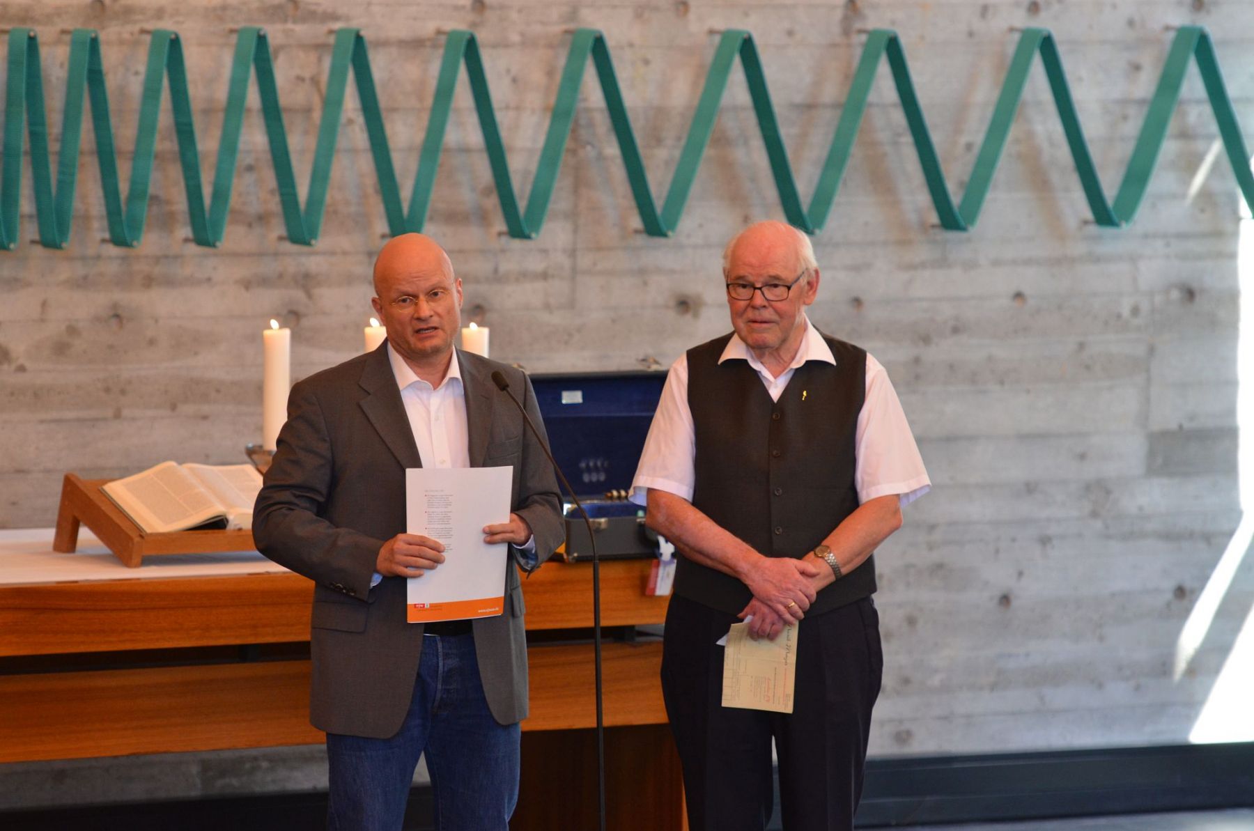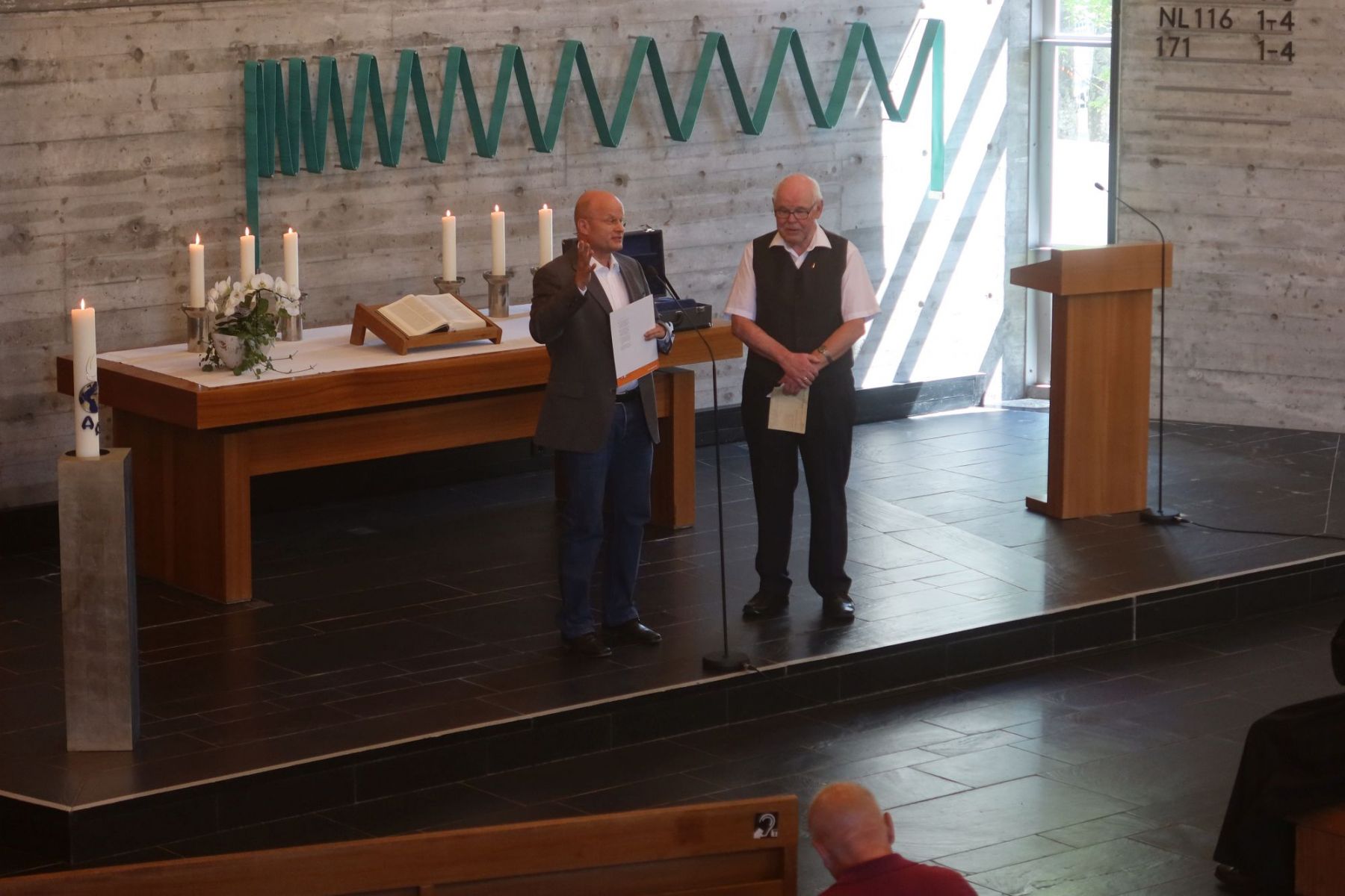 Anläßlich des Gemeindefests in Oberkochen hatten beide Kirchengemeinden (Oberkochen und Unterkochen-Ebnat) zum gemeinsamen Gottesdienst mit den Pfarrern Marco Frey und Manfred Metzger eingeladen. Das Evangelische Jugendwerk in Württemberg (EJW) – „Dachverband“ der Posaunenchöre – in Person von Konrad Elsässer, Mitglied des Fachausschusses „Posaunen“ verlieh Erwin für seine langjährige Bläser-Tätigkeit im Gottesdienst eine Urkunde und die Ehrennadel des EJW in Gold (siehe Bild).