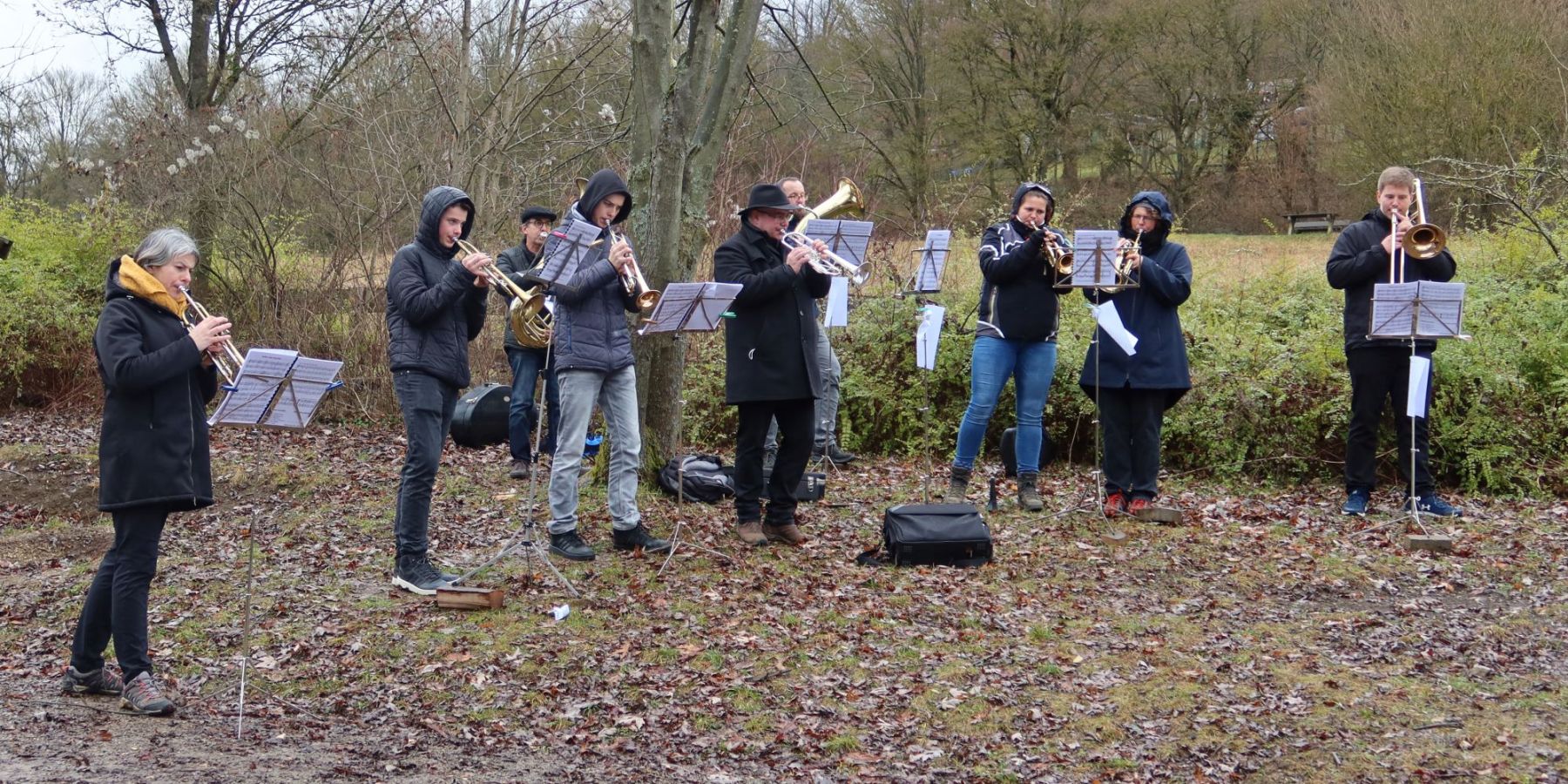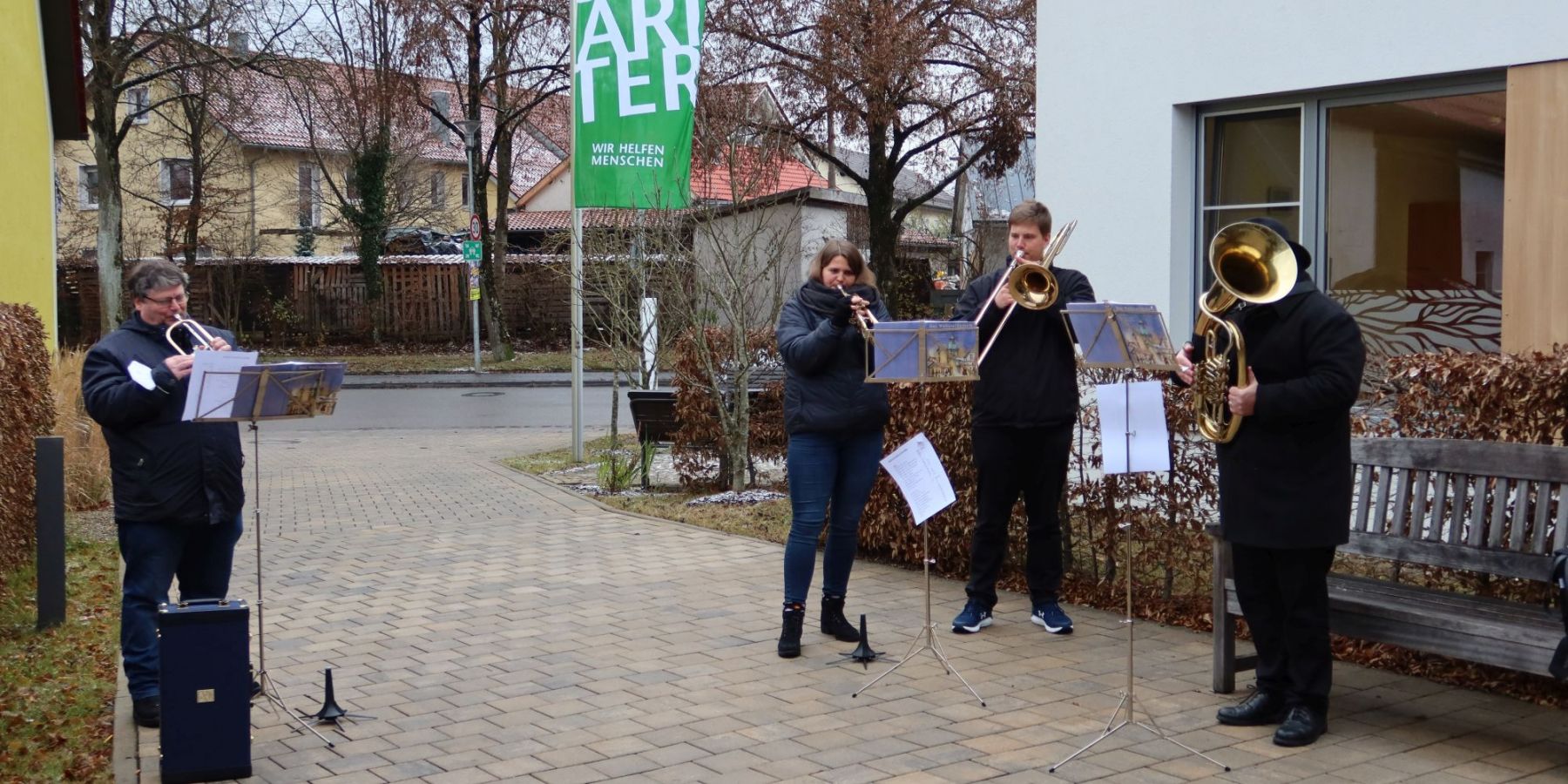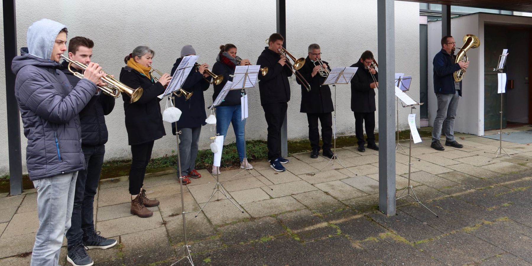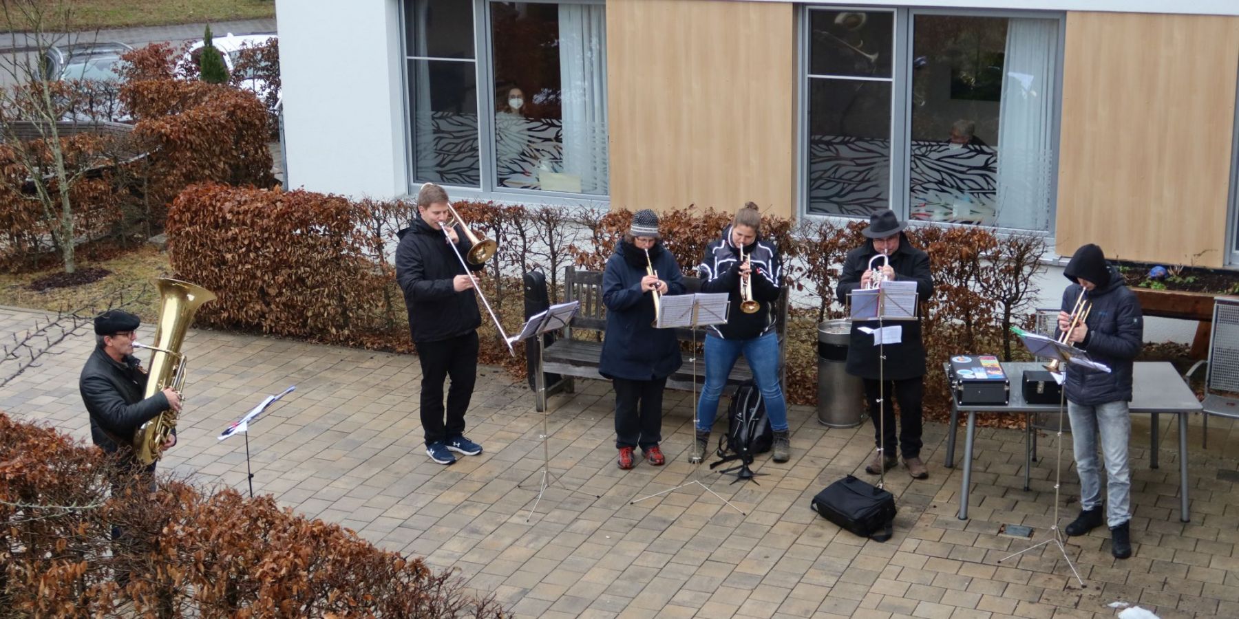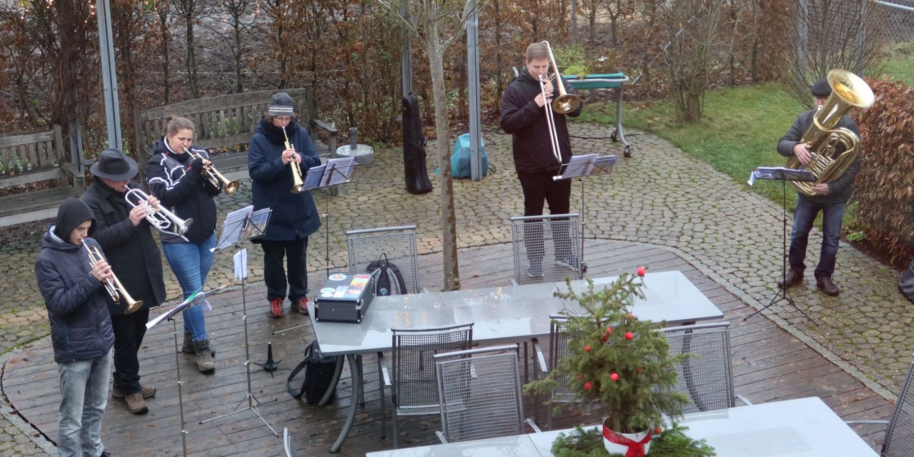 Erfreulicherweise hatten wir auch in den letzten Tagen des Jahres 2021 noch einige Einsätze: zuerst am Heiligabend um 14 Uhr beim Krippenspiel unserer Kirchengemeinde in unserem Naturkindergarten in Unterkochen. In kleinerer Besetzung gings dann weiter zum Kurrendeblasen beim Samariterstift in Ebnat. In „normalen“ Jahren spielen wir dort im Haus in jeder der 4 Stationen. Da dies gegenwärtig nicht möglich ist, spielten wir vor und hinter dem Haus jeweils etwa eine halbe Stunde lang Weihnachtslieder. Für die Bewohner des Samariterstifts und uns war es – wie jedes Mal – eine große Freude!
